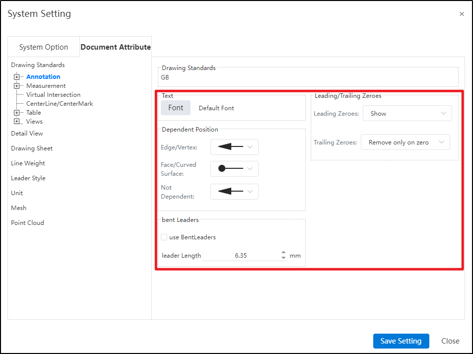 Leading/Trailing Zero Values: Supports configuring the display format for "leading zeros" and "trailing zeros," controlling how values obtained through associated properties (e.g., mass, length) are displayed in annotations.