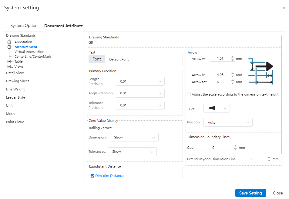 Arrow size: Supports setting the style of dimension arrow size, allowing individual adjustments for arrow width, head length, and head plus leader length (leader extending beyond the arrow). It also allows setting the default arrow type and default arrow position when creating dimensions.