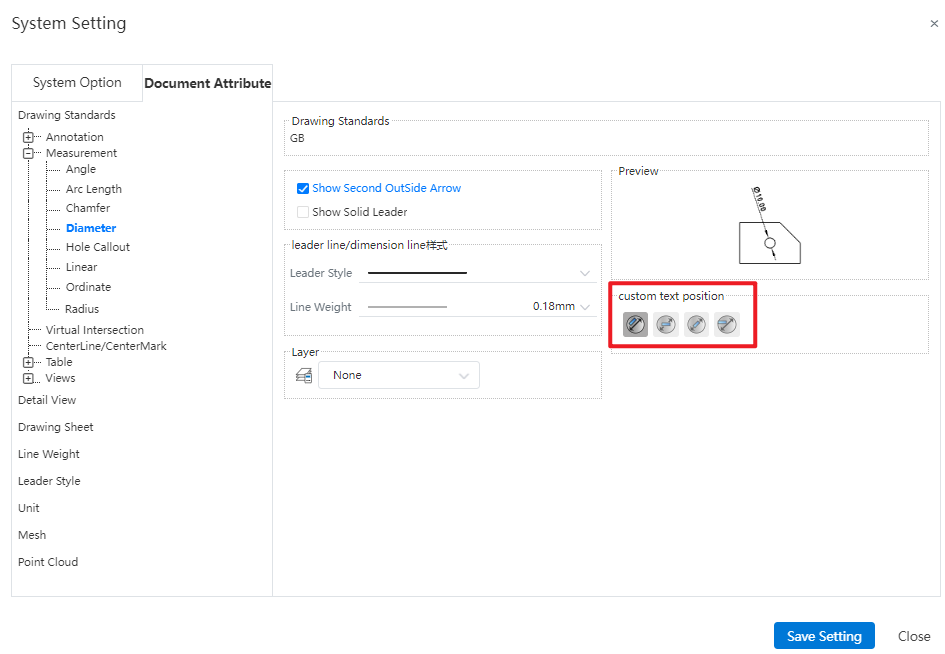 Text Position: Supports setting the default text position for corresponding dimensions in "Document Properties - Dimensions - Angles, Arc Length, Chamfer (Leader Only), Diameter, Radius (Leader Only), Linear". Controls the default state of the "Custom Text Position" option in the respective dimension commands.
