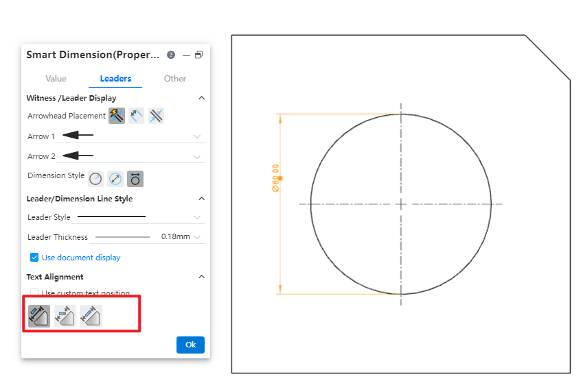 - Leader/Dimension Line Style: Supports setting the line style and line width of leaders for corresponding dimension annotations in "Document Properties - Dimensions - Angles, Arc Length, Chamfer (Leader Only), Diameter, Radius (Leader Only), Linear".