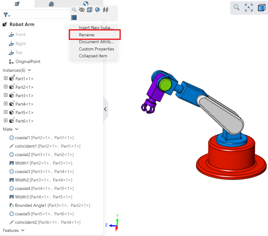 Note: In part documents, the corresponding command is "Rename Part"; in assembly documents, if renaming the entire assembly, the corresponding command is "Rename Assembly". If renaming an inserted instance, the corresponding command is "Rename"; in drawing documents, the corresponding command is "Rename Drawing".