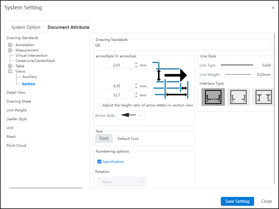 Added font settings, supporting individual font configuration for "Part Number, Datum, Geometric Tolerance, Datum Target, Notes, Revision Cloud, Surface Roughness, Welding Symbols" under annotations in system settings.