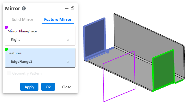 Edge flange feature supports mirroring, enabling quick creation of symmetric sheet metal features and improving modeling efficiency.