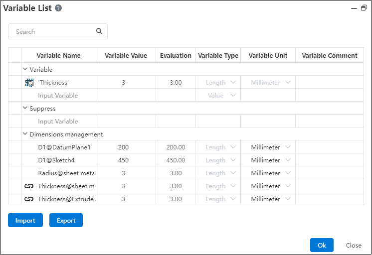 Note:After generating the sheet metal body, a "Thickness" variable with a sheet metal icon will appear in the variable manager, and the thickness of the cut will match the value of this variable.