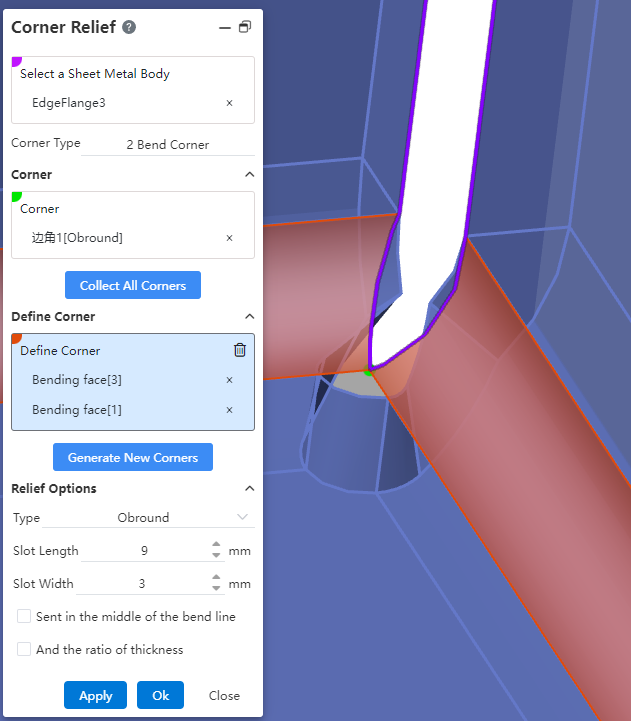 Click "Collect All Corners" to automatically pick corners, or manually select the bend faces on both sides of the corner and then click the "Generate New Corner" button to manually pick the corner.