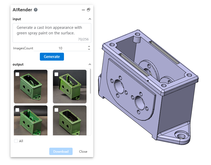 Introducing AI Render, which leverages existing 3D models, combines user input text, and specific requirements to automatically generate multiple high-quality images, with support for downloading them.