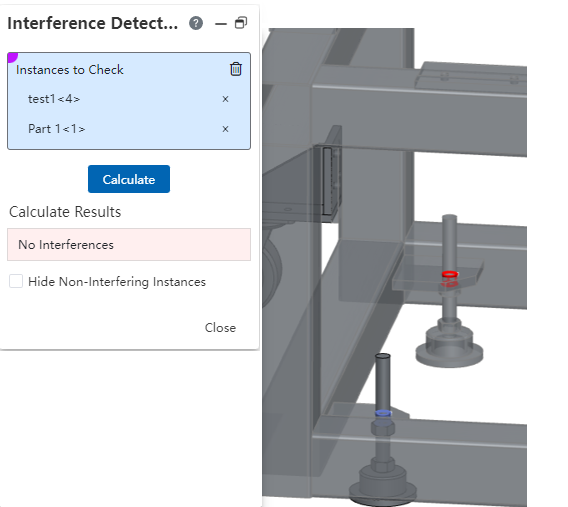 Example: Pick the instance to be checked, the interference part is represented by the blue outline, and the interference check result is shown in the following figure:
