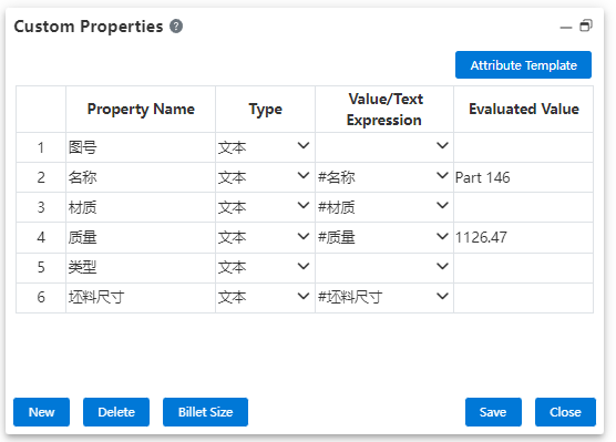 - Directly click the BOM toolbar - [Custom attribute] (or right click the document name in the feature panel, click [Custom attribute]), the property box appears, the default common attribute content is: picture number, name, material (only parts, assembly without this option), quality, billet size.