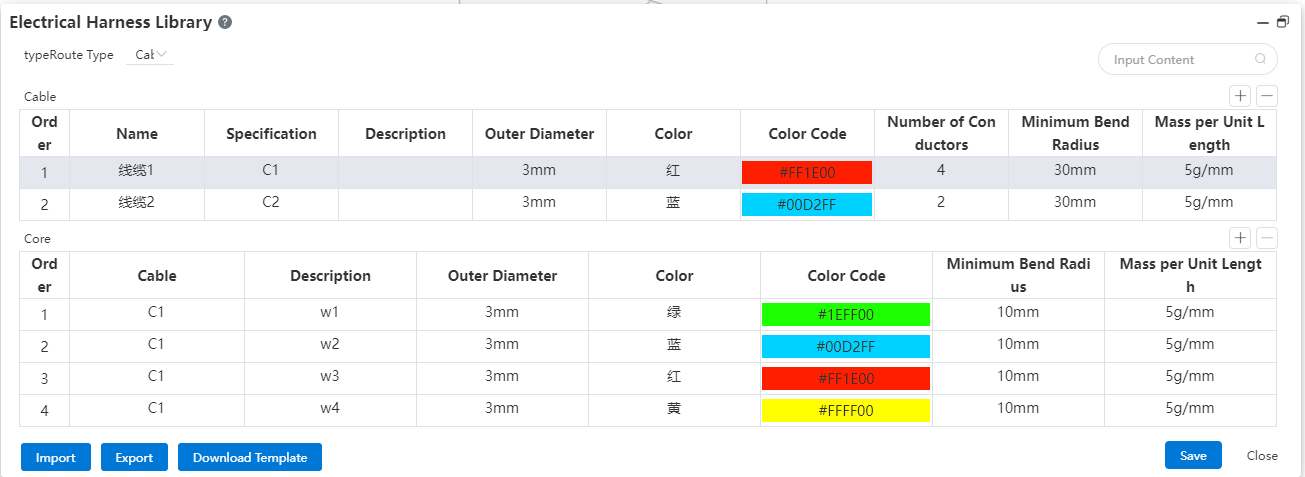 | Outer Diameter | Electrical Harness Diameter, representing the diameter of the generated route entity.After entering a value, display a unit dropdown. After selecting a unit, convert the input parameter to mm units for storage. | Wire,Electrical Harness, Conductor |