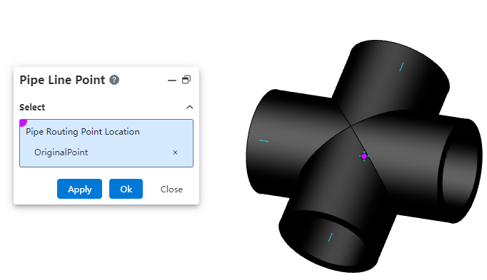 Note:Please note the concepts of route points and connection points. Connection points are used to determine the connection locations of piping, while route points are used to determine how the piping component is positioned on the 3D route sketch. The following elements can be picked for route point positions: origin, sketch point, endpoint of an edge/sketch line, circular edge, or circular plane.