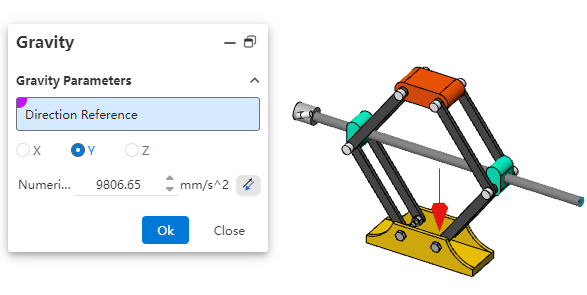 Note: Gravity is typically used in conjunction with motors, forces/torques. When defining gravity using a 3D coordinate system, there's no need to pick geometric elements.