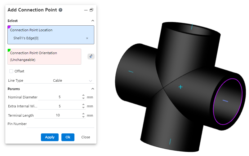 Offset: Controls whether the connection point starts from an offset along the connection point direction from the initial position. By default, this is unchecked.