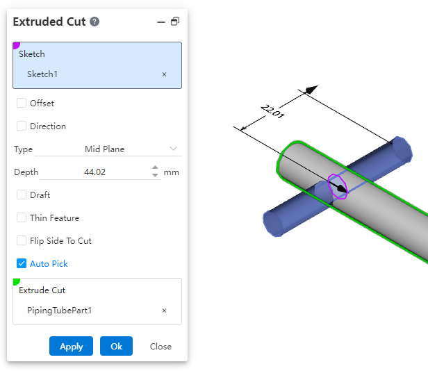 Use the "Edit Part" function under the Assembly module to add features to the pipe.