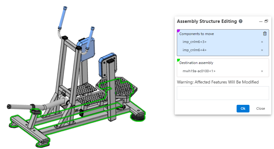 Supports moving components from a higher-level sub-assembly to a lower-level sub-assembly, or vice versa, to adjust the hierarchical structure of the components.