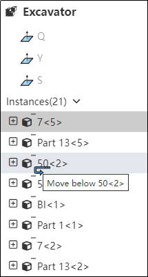 2) Drag and drop the part instance while holding down the left mouse button in the feature panel.