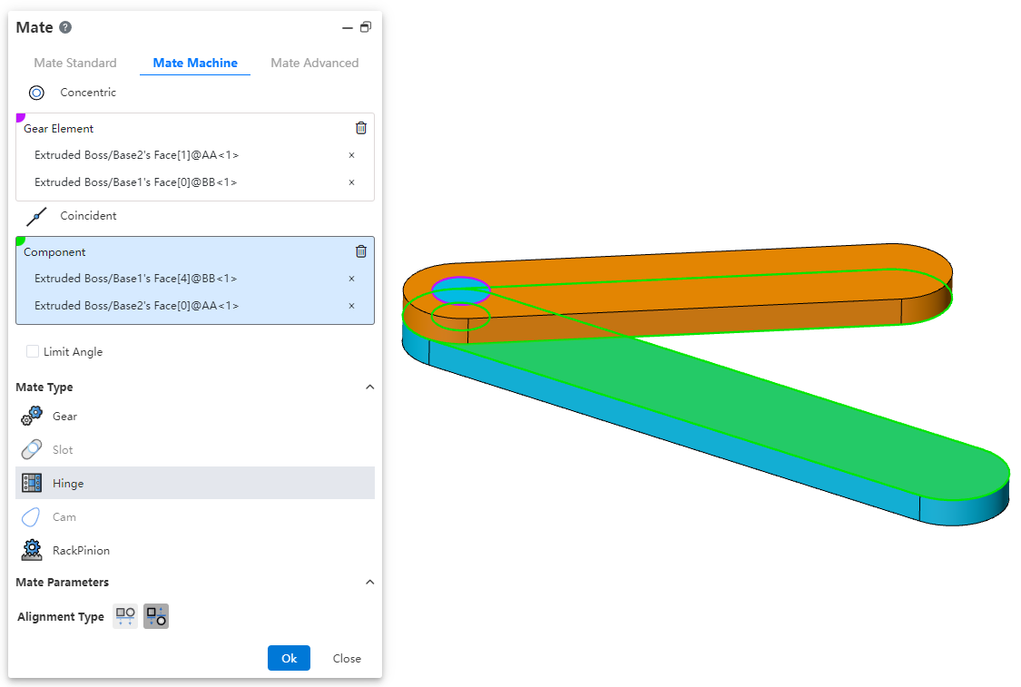 Limit Angle: Check this, select the plane belonging to the two parts respectively, set the Angle range of the two faces can be rotated relative to each other in the fit parameters.