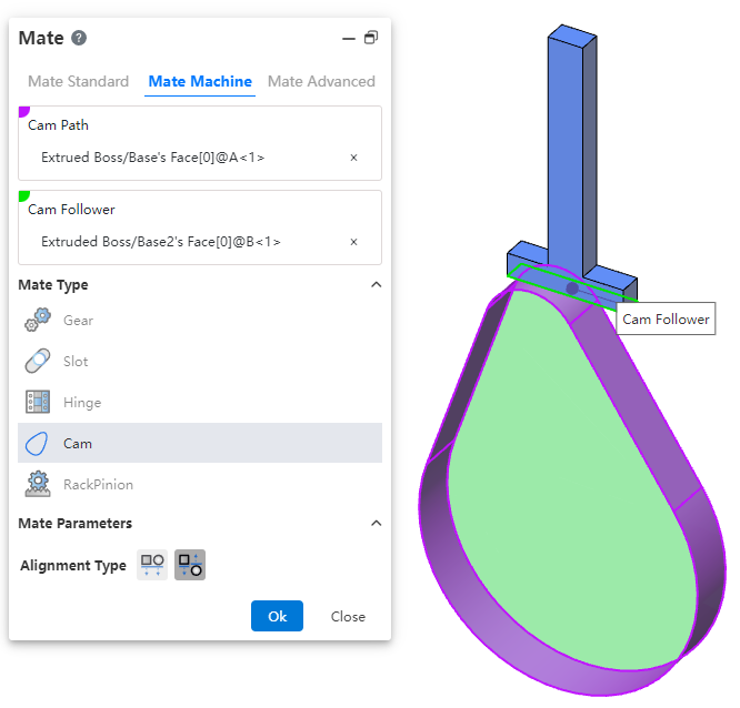 After inserting the cam and follower parts, click the "Mate - Mechanical - Cam" command.