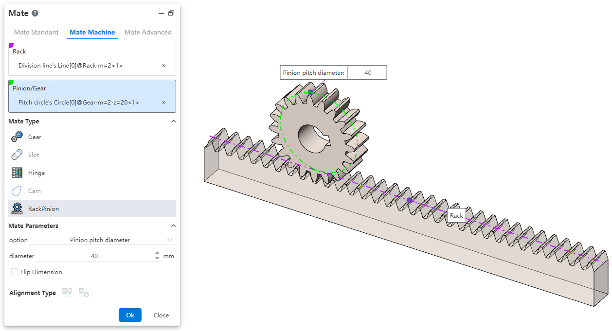 Note: Both rack and pinion support curves, cylindrical surfaces, and arc surfaces as pickable elements. This mating type can also be applied without drawing a gear, and can be achieved using linear edges, circular edges, and other features.