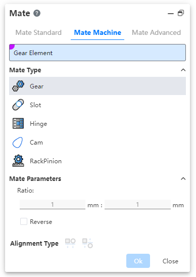 Mate commands are used to create coincident, parallel, perpendicular and other geometric relationships between assembly components, and to move components within their degrees of freedom. Its command interface is as follows: