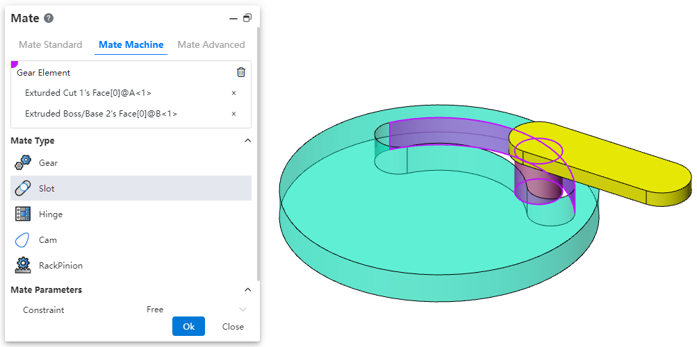- Constraint: Choose a positional constraint relationship between two elements. Take the cylinder and notch fit as an example: