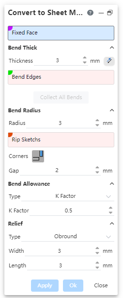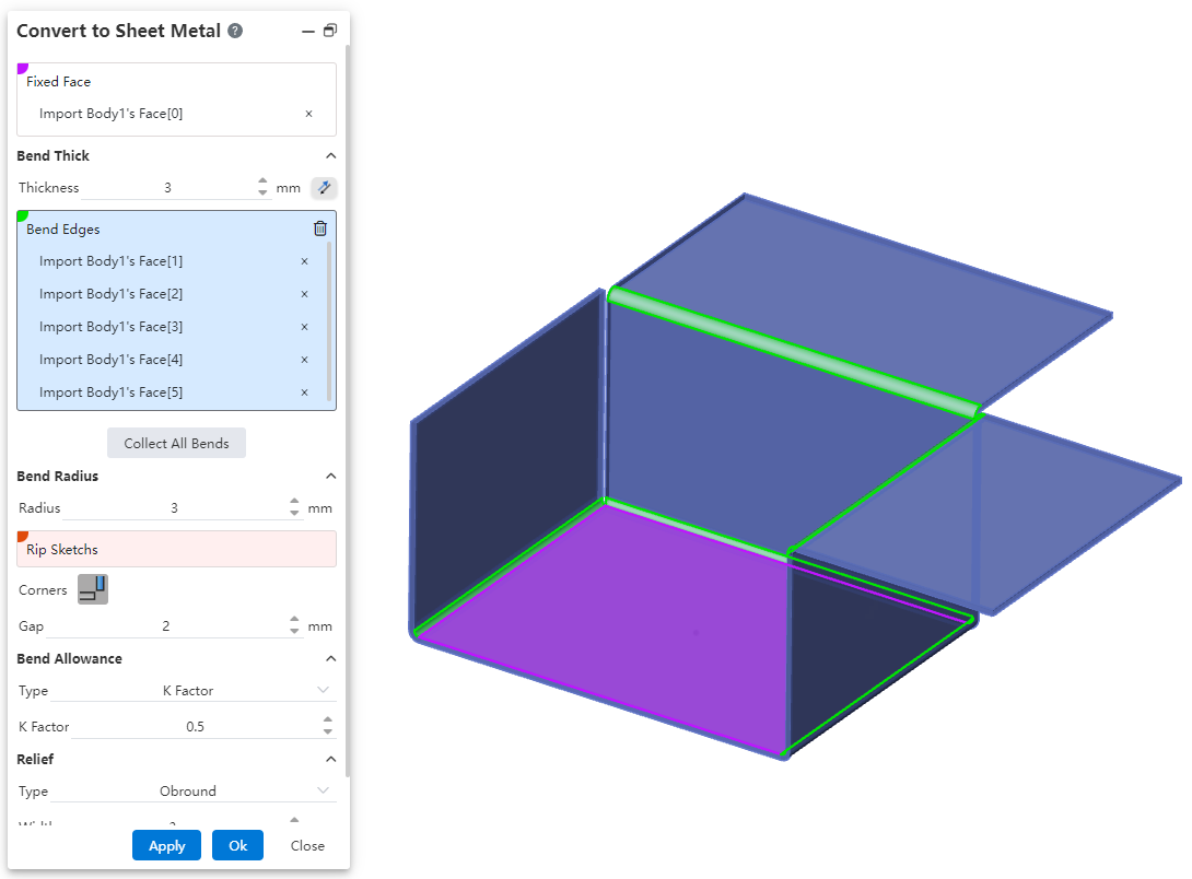 1) Fixed face: Only one face of the entity can be selected as the fixed face, and the matrix flange or the face that has been converted to sheet metal cannot be selected. Only single option can be selected.
