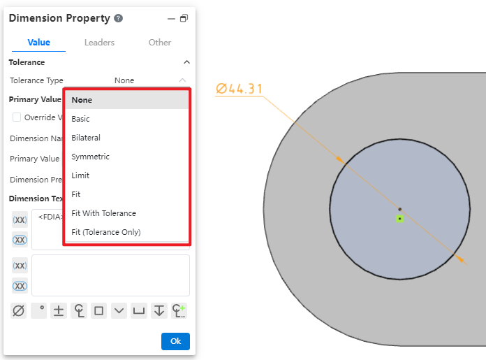 Sketch dimensions support selecting multiple tolerance types. Refer to section Drawing-Dimensions for usage instructions.