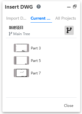 - Support selecting dwg files that have been imported in the current project or other projects, as well as directly importing dwg documents locally. After clicking the import button, the document will be imported into the project and inserted into the current sketch.