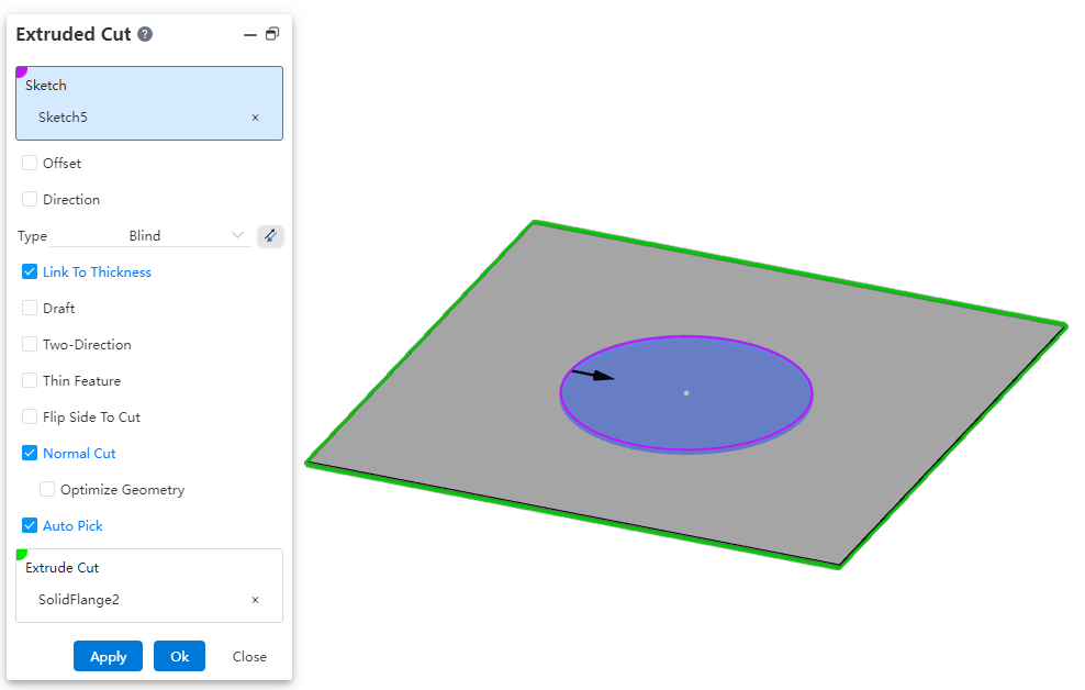 - Direction:After checking, open the direction pick box, the direction vector stretches the sketch in the direction perpendicular to the sketch outline, and if not selected, the direction is stretched according to the sketch method.