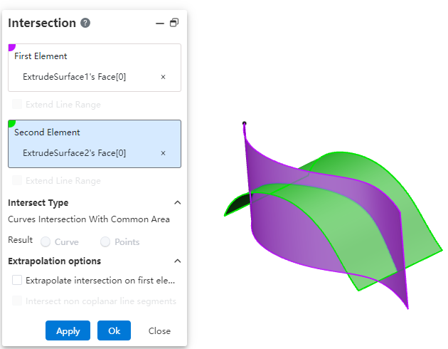 Extend Intersection Beyond First Element: When two surfaces intersect and the second surface is smaller than the first, enabling this option extends the intersection curve beyond the boundary of the first surface.