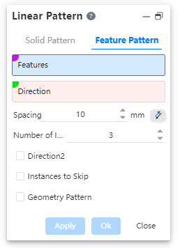 - Features: Pick up the features that need to be copied by the array, can be multiple selected.Support selecting already arrayed features as source features for further arraying.