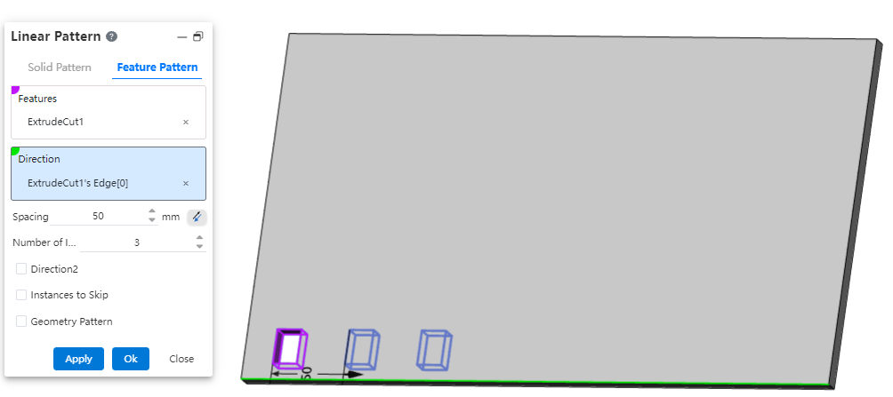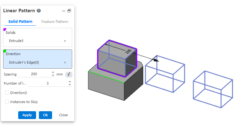 Example: Pick an entity, pick an edge of the entity as the pattern direction, after setting the parameters, the linear array effect is shown in the following figure.