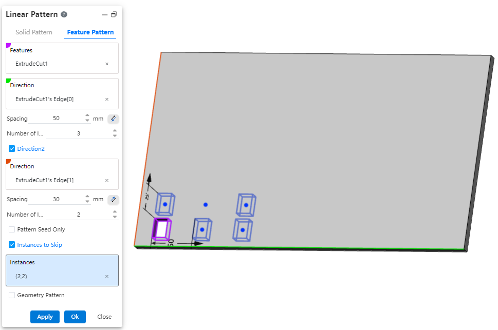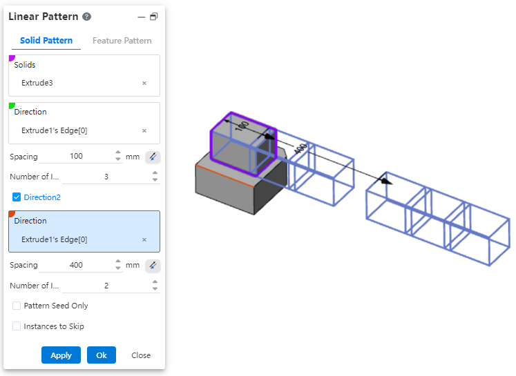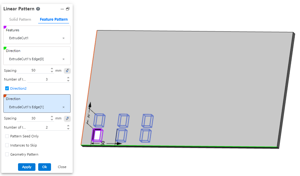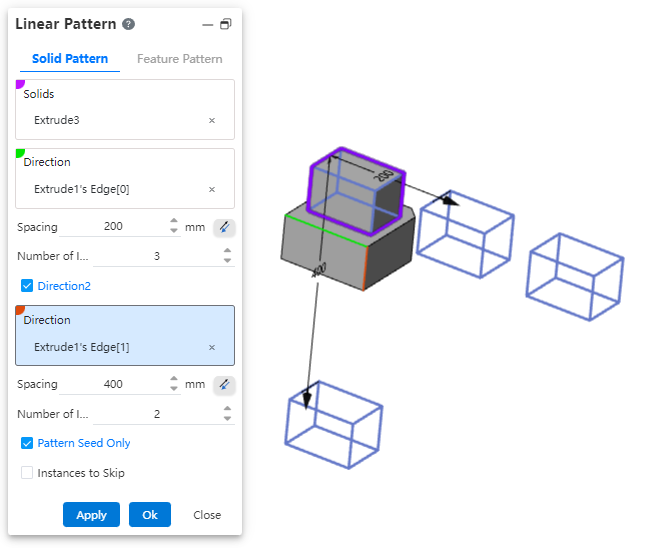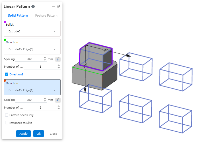 Example: Pick another line in the rectangle on the solid as the second direction, check Only Array Source, and preview the effect as shown in the following image.