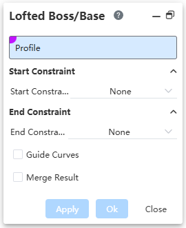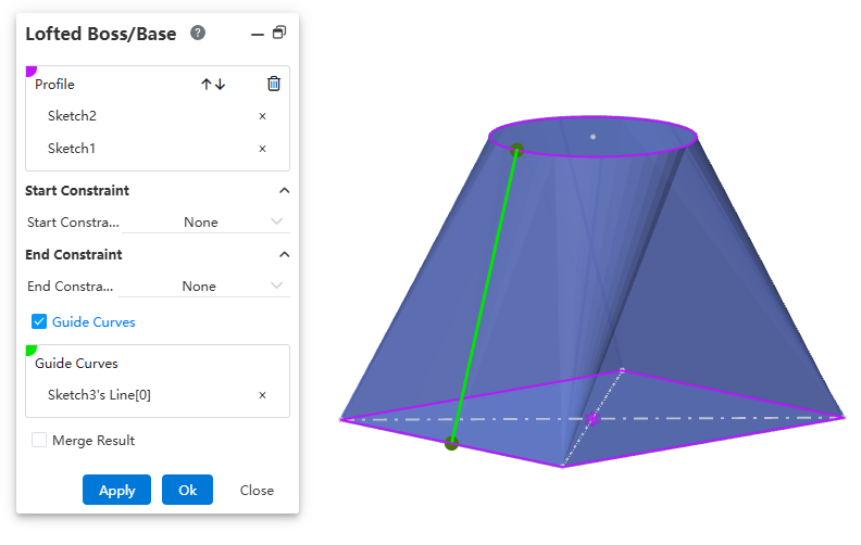 Guide line: Through the guide line control lofting external outline, you can choose sketch line, edge line or curve, support multiple selection.