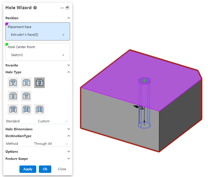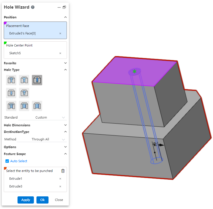 Example: select the straight hole style and select Through All for the extension mode, as shown in the following image.