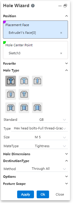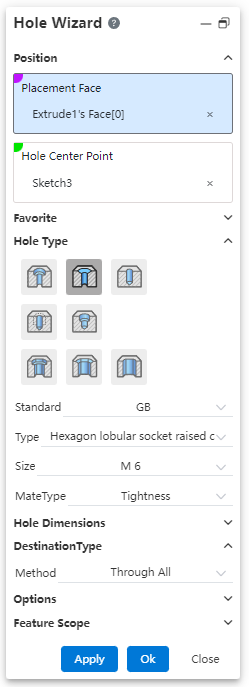 Click the toolbar to open the Hole Command dialog box, whose command interface is shown in the following figure.