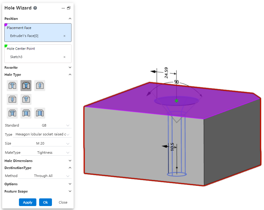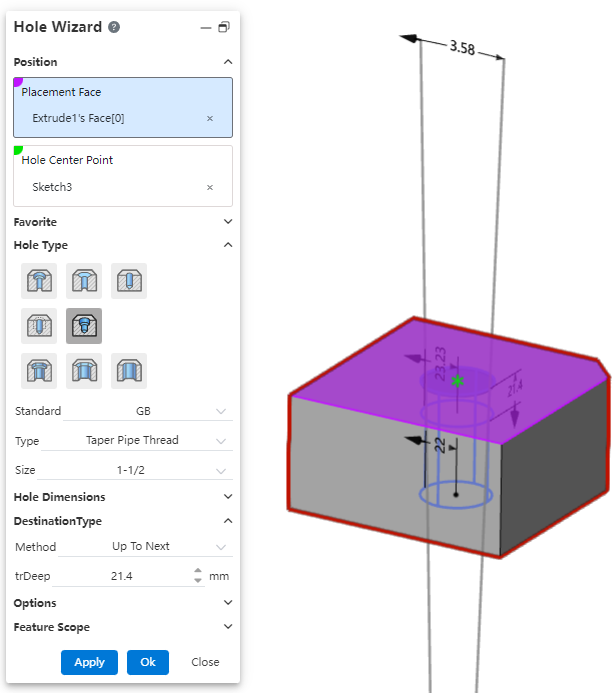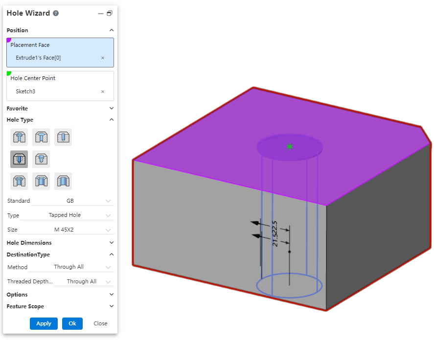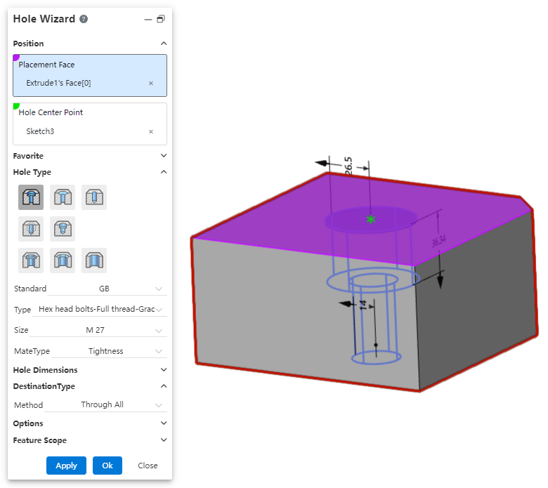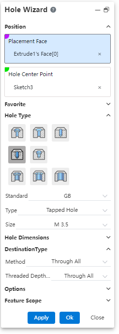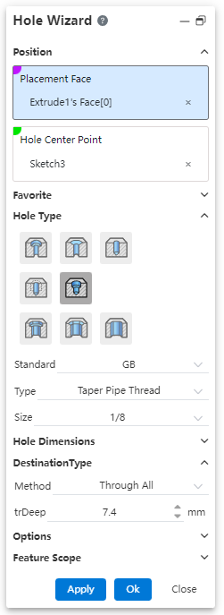 Thread Depth:Set the termination method and depth when the hole type is "Threaded Hole".