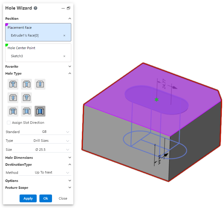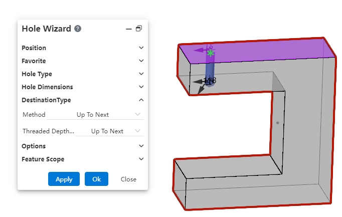 Up to next:When this option is selected, there's no need to manually calculate the hole depth—the hole will automatically terminate at the next face.