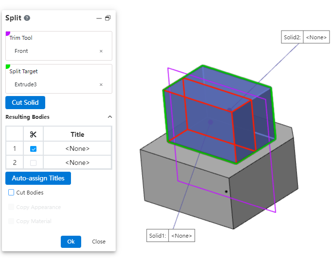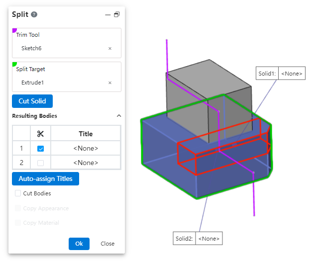 - Sketch segmentation: When selecting a 2D sketch line, divide the entity and surface along the normal direction of the sketch plane; Select a 3D sketch or space curve that completely coincides with the surface to segment the surface, but not the entity.