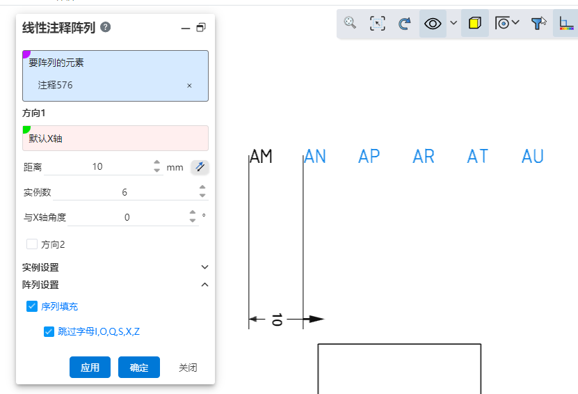 - 序列填充:控制是否对所选注释进行序列填充,序列填充仅支持对单一方向纯字母或纯数字的注释进行阵列,如“AA”或“1”。默认不勾选,勾选后自动进行序列填充。