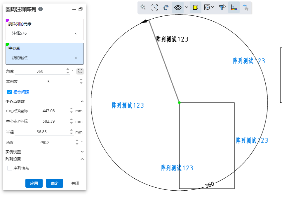 - 中心点:控制注释阵列的中心点,默认为工程图原点。支持拾取点元素手动设置阵列中心点位置。