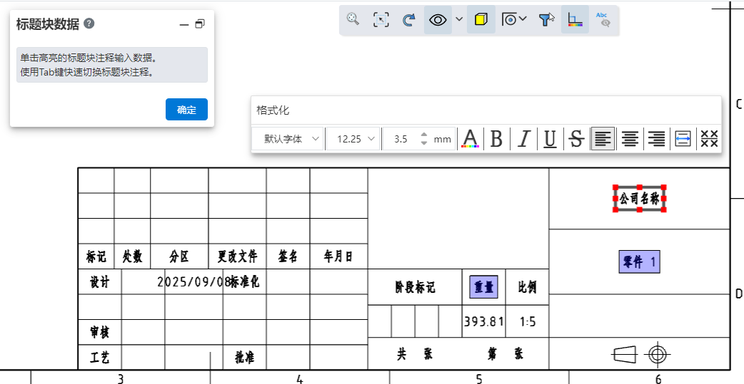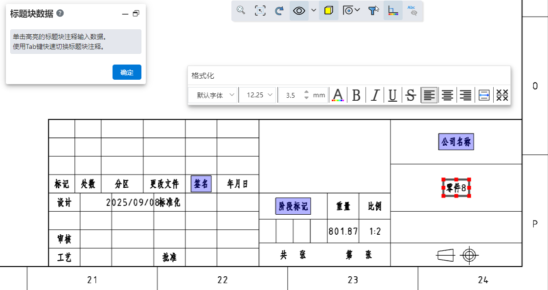 - 单击确定,完成标题块特征创建。