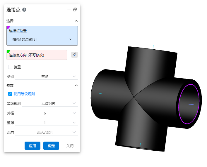 连接点是一个特征,显示为一个方向轴,用来控制管子的起点/终点,也可以控制管路零件之间的连接。