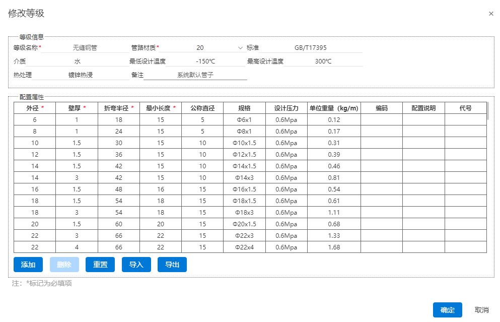- 在修改等级界面,可以任意对管子的等级信息以及配置属性的参数进行修改、添加、删除、导入导出以及重置。只有系统默认等级规则才可以将数据重置。