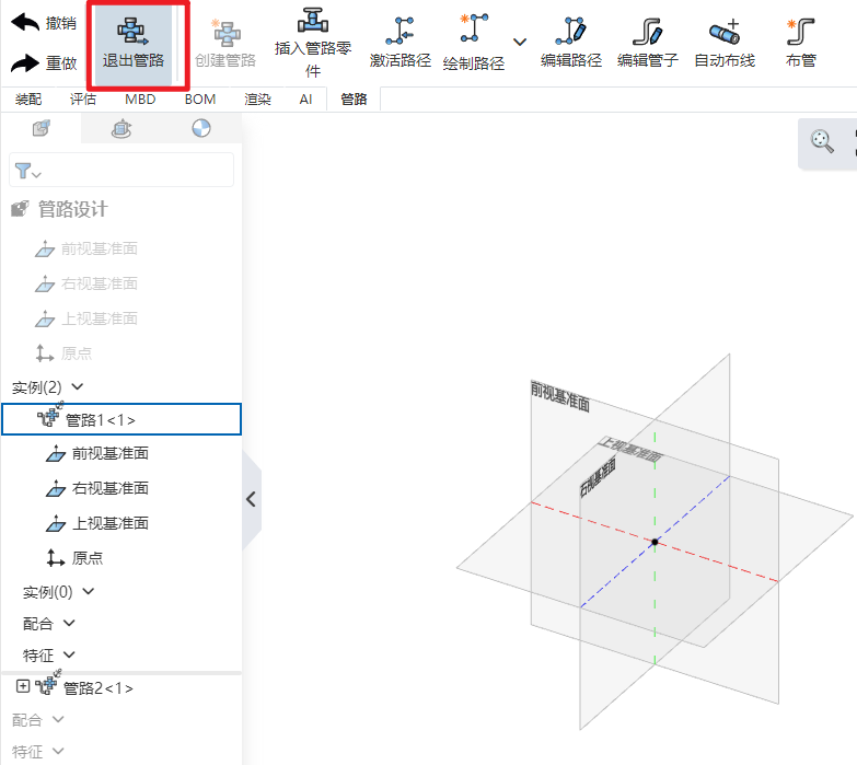- 点击左上角“退出管路”,左侧特征树的管路实例无高亮,则代表已经退出管路。