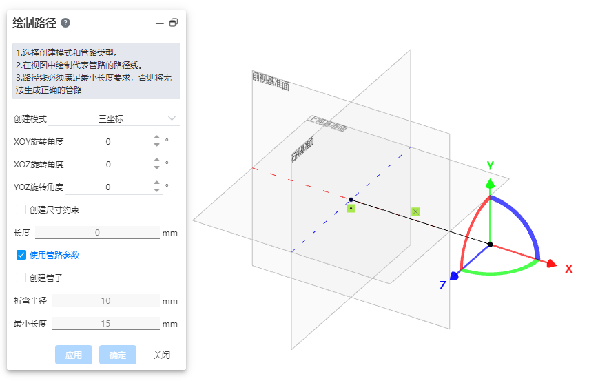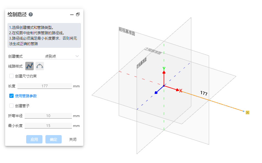 - 使用管路参数:勾选后,绘制路径的后续所有尺寸参数置灰,并使用“管路参数”中的数据。若不勾选,可以自定义管路参数。