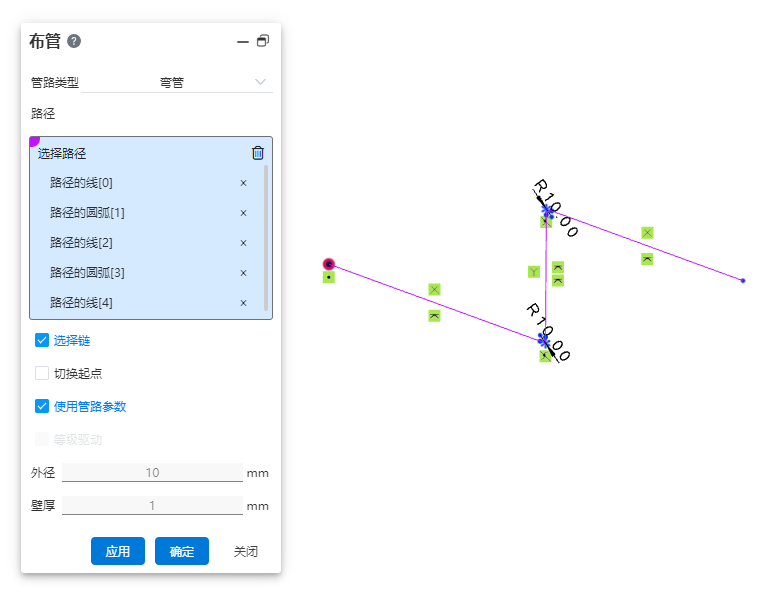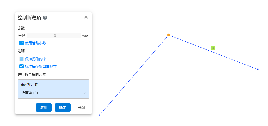 - 使用管路参数:勾选此项,半径大小不可修改。默认为10mm。不勾选此项,可以自定义折弯角大小。