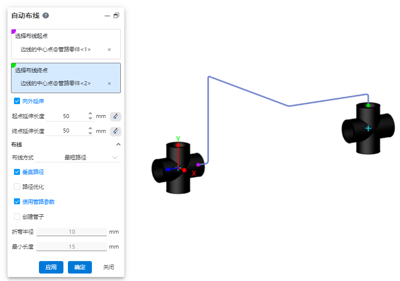 创建或激活管路后,在所选的两个连接点之间自动绘制路径线。