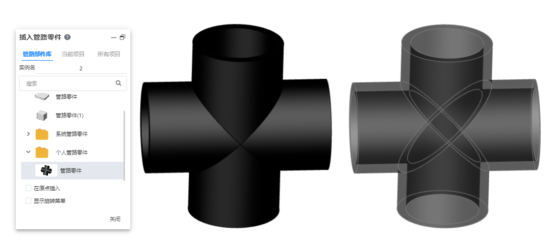 使用方法与在装配中插入零部件一致。管路模块拥有单独的管路部件库。