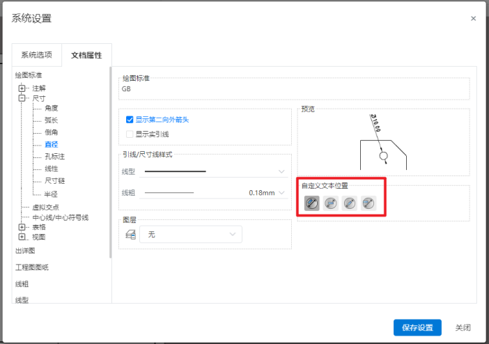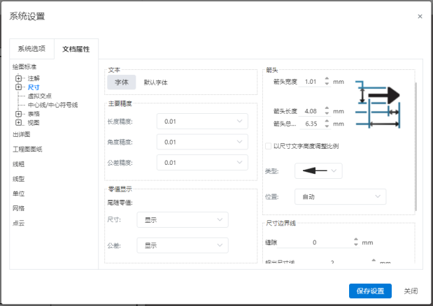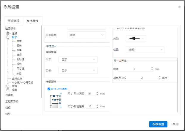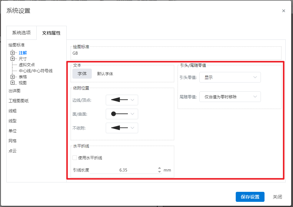 系统设置-文档属性-注解新增依附位置、水平折线以及尾随零值设置项。