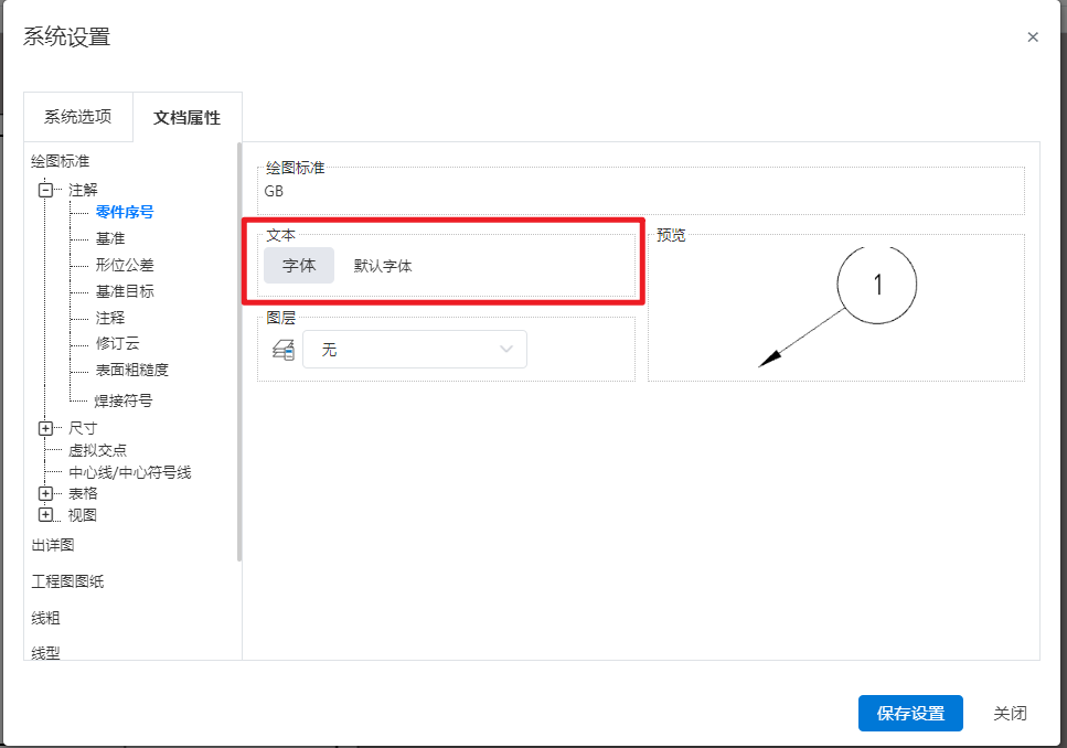 新增字体设置,支持在系统设置中对注解下的“零件序号、基准、形位公差、基准目标、注释、修订云、表面粗糙度、焊接符号”单独设置不同的字体。